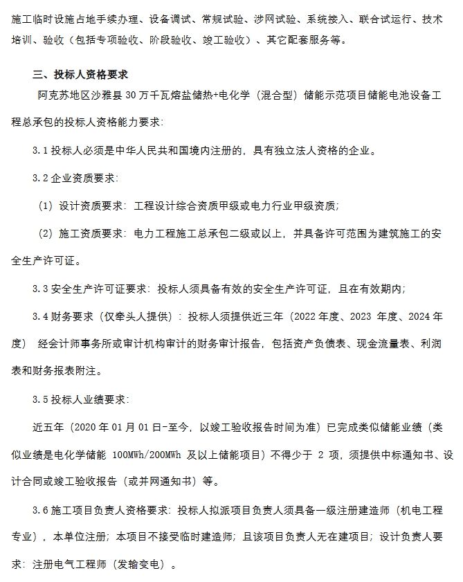 標(biāo)段項目二:阿克蘇地區(qū)沙雅縣30萬千瓦熔鹽儲熱+電化學(xué)(混合型)儲能示范項目電化學(xué)+匯集站升壓變電站等EPC總承包,投資約92000萬元。