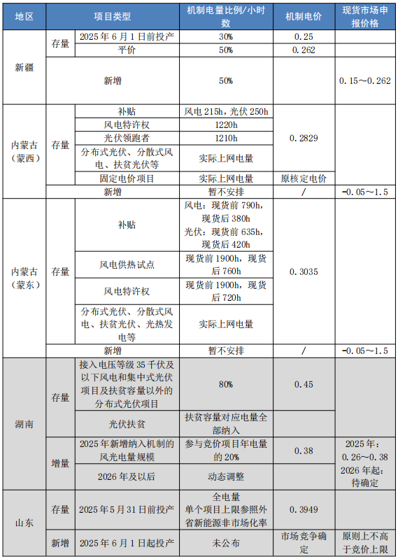 根據(jù)136號文要求,最遲于2025年底,各地需出臺并實施新能源可持續(xù)發(fā)展價格結算機制的地方性方案。為按時完成任務,截至2025年6月末,四川、云南、廣西、陜西四省相繼啟動了新能源發(fā)電成本調研工作,山東發(fā)布了新能源電價市場化改革的征求意見稿,湖南新能源市場化改革的暫行方案已于6月1日開始執(zhí)行,新疆、內蒙古(含蒙東、蒙西)發(fā)布了本地區(qū)新能源可持續(xù)發(fā)展價格結算機制的正式方案,各地推動新能源市場化步伐明顯加快。