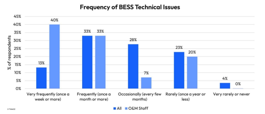 該調(diào)查發(fā)現(xiàn),“73%的運(yùn)維人員每月至少遇到一次技術(shù)問題,而電池儲能系統(tǒng)的資產(chǎn)管理人員只有53%。此外,40%的運(yùn)維人員報告每周都會遇到問題,這一比例是資產(chǎn)管理人員的兩倍?!?/strong>