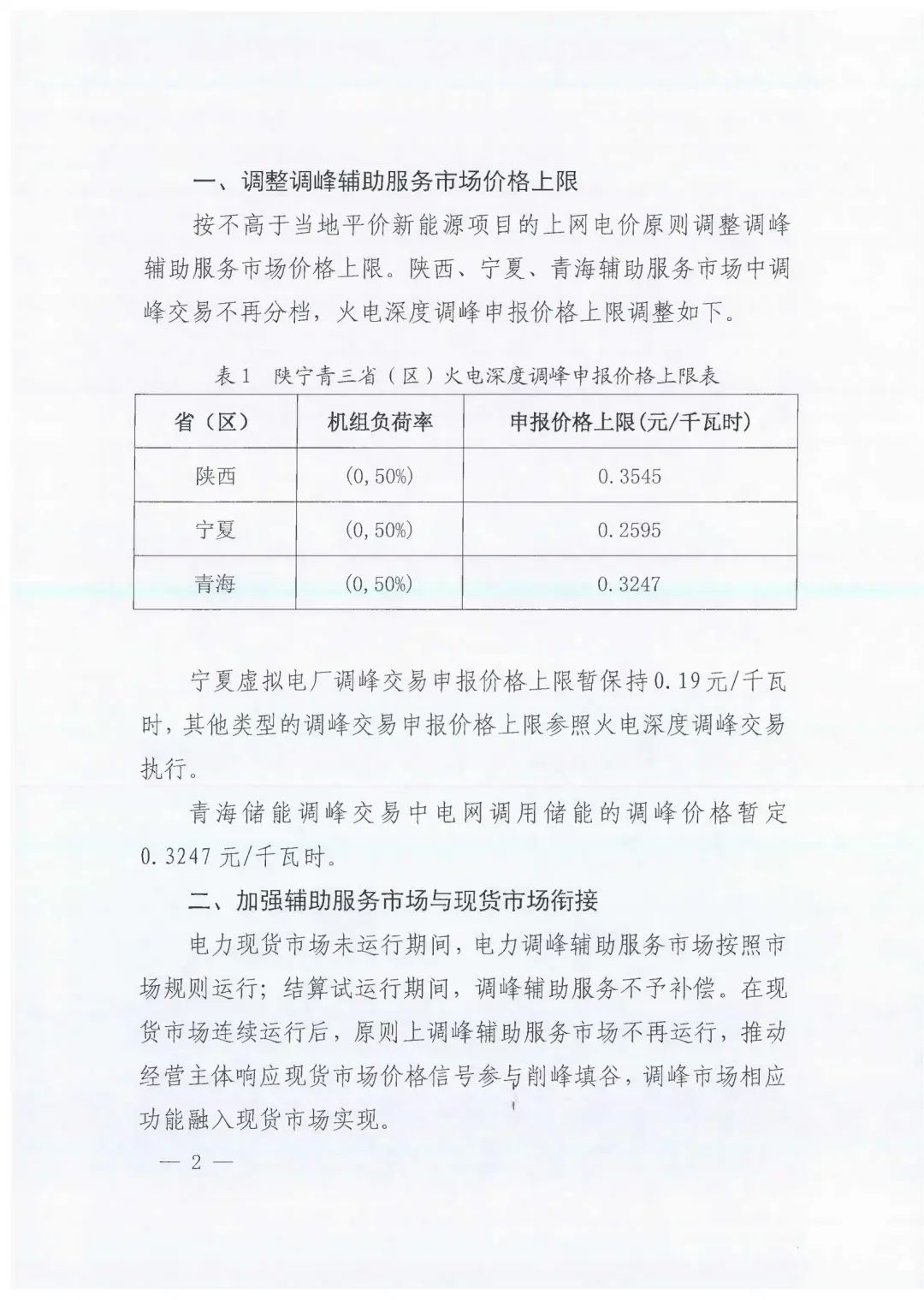 文件明確,按不高于當(dāng)?shù)仄絻r新能源項目的上網(wǎng)電價原則調(diào)整調(diào)峰輔助服務(wù)市場價格上限。陜西、寧夏、青海輔助服務(wù)市場中調(diào)峰交易不再分檔,火電深度調(diào)峰申報價格上限調(diào)整如下: