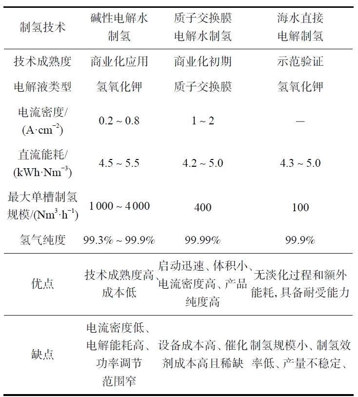 除傳統(tǒng)純水電解制氫路線外,利用海水直接電解制氫技術也是近年來發(fā)展海上風電制氫的重要技術路徑之一。海上風電電解水制氫技術對比如下表所示。