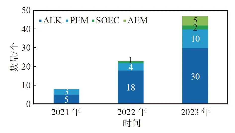 二是大型企業(yè)加快布局促使海上風電制氫產(chǎn)業(yè)鏈市場格局和技術路線都呈現(xiàn)出多元化發(fā)展趨勢。市場格局方面,三股“電解槽裝備生產(chǎn)新勢力”加入——以金風科技、明陽智能、三一重工為代表的風電材料部件及裝備企業(yè)(綠電配套供應方),以上海重塑、廣東清能、北京億華通等為代表的氫燃料電池企業(yè)(技術正向開發(fā)方),以電力、航天、船舶等領域國央企(風電資源方)都在推進業(yè)務延伸與閉環(huán),實現(xiàn)產(chǎn)業(yè)鏈整合。因此,市場格局正在從過去以蘇州競立制氫設備有限公司、中國船舶集團第七一八研究所、天津市大陸制氫設備有限公司為代表的老牌電解槽生產(chǎn)企業(yè)“三分天下”,逐步向多領域、多群體“群雄逐鹿”轉變。技術路線方面,從堿性槽單一主導向多種技術共同發(fā)展轉變,PEM電解槽市場規(guī)模逐漸增大,SOEC、AEM電解槽產(chǎn)品下線數(shù)量逐年遞增。2023年以來,我國5兆瓦堿性電解槽實現(xiàn)規(guī)模化生產(chǎn)和應用能力,10兆瓦產(chǎn)品已陸續(xù)下線;PEM電解槽實現(xiàn)兆瓦級產(chǎn)品下線,開展實證示范應用;SOEC電解槽逐步走出實驗室,200千瓦級產(chǎn)品投入運營;AEM電解槽實現(xiàn)10千瓦級產(chǎn)品下線,但仍有待實證驗證。從電解槽下線數(shù)量來看,2023年共有47個電解槽產(chǎn)品實現(xiàn)下線,相比2022年增加一倍,其中堿性電解槽下線數(shù)量達到30個。