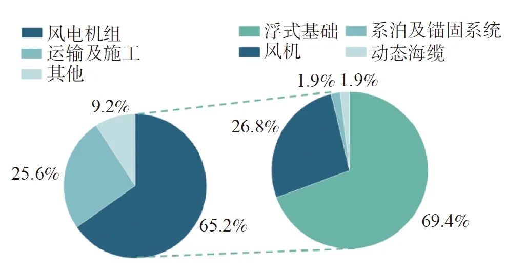 在建設投資方面,海上風電制氫項目的投資成本較高,主要體現(xiàn)在風電設備、電解水制氫設備、氫氣儲存和運輸設施等方面。海上風電項目施工難度高,受不同海域建設條件差異影響較大,使得不同項目單位造價差異較大,特別是漂浮式海上風電項目,國內(nèi)項目平均單位造價約5.47萬元/千瓦。下圖展現(xiàn)了漂浮式海上風電項目的各項成本構成,其中浮式基礎在風電機組成本中占比最高,接近70%,海上風電基礎下降是漂浮式海上風電項目降本的重要手段之一。同時由于氫氣的市場需求尚未完全啟動,海上風電制氫項目的投資回報周期較長,這也給投資者帶來了較大的風險;此外,海上風電制氫項目需要考慮對海洋環(huán)境的影響,以及與漁業(yè)和其他海洋活動的兼容性,這些因素可能會增加項目的復雜性和成本。
