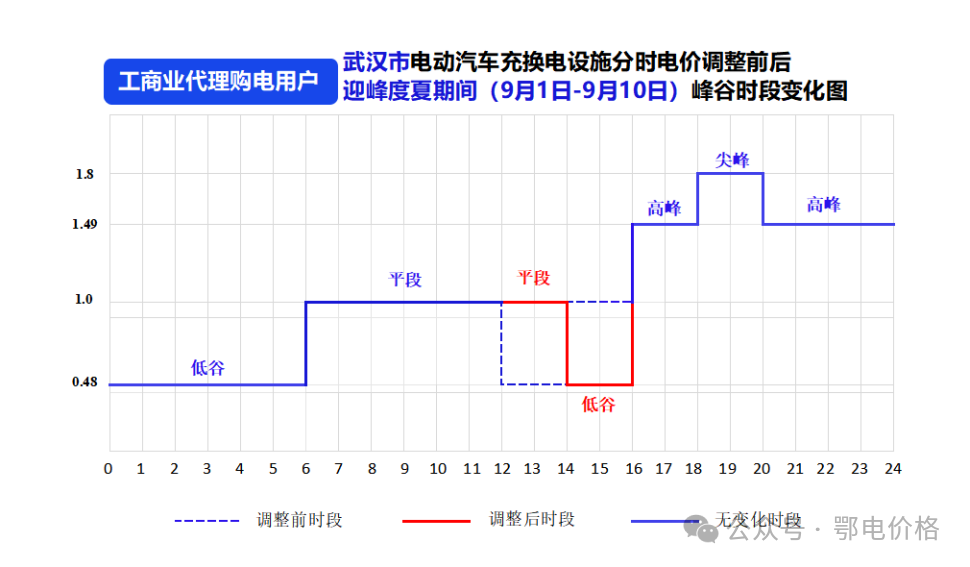 在此背景下,2025年6月25日,湖北省發(fā)改委公布了《關(guān)于2025年迎峰度夏期間臨時(shí)調(diào)整武漢市工商業(yè)電動(dòng)汽車(chē)充換電設(shè)施分時(shí)電價(jià)政策的通知》,規(guī)定在2025年迎峰度夏期間(7月10日至9月10日),武漢市執(zhí)行工商業(yè)代理購(gòu)電價(jià)格的電動(dòng)汽車(chē)充換電設(shè)施用電,12:00-14:00由原低谷時(shí)段調(diào)整為平時(shí)段,14:00-16:00由原平時(shí)段調(diào)整為低谷時(shí)段。