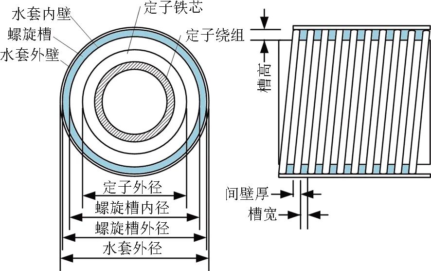 傳統(tǒng)的冷卻方式有風(fēng)冷、液冷和混合冷卻。飛輪儲(chǔ)能系統(tǒng)用電機(jī)的功率密度大,需要處于真空環(huán)境,對(duì)空間限制較為寬松。風(fēng)冷換熱能力有限,且需要建立內(nèi)部流道、破壞真空環(huán)境,因此并不適用。液冷通過在電機(jī)定子或外殼設(shè)置密封循環(huán)流道,不影響轉(zhuǎn)子的真空環(huán)境,換熱能力強(qiáng),經(jīng)濟(jì)實(shí)用,非常適用于飛輪儲(chǔ)能系統(tǒng)用電機(jī)定子的冷卻。針對(duì)電機(jī)定子水套冷卻的設(shè)計(jì),常用三種計(jì)算方法,簡化公式法、等效熱網(wǎng)絡(luò)法和數(shù)值計(jì)算法。簡化公式法通過熱平衡計(jì)算得到相應(yīng)溫升及設(shè)計(jì)參數(shù),計(jì)算簡便且理論性強(qiáng),但需要進(jìn)一步校核和檢驗(yàn)。等效熱路法利用集總參數(shù)法等效各部分的熱源及熱阻,并建立熱網(wǎng)絡(luò),其計(jì)算精度適中,取決于網(wǎng)絡(luò)節(jié)點(diǎn)數(shù)量。數(shù)值解法通過建立詳細(xì)的計(jì)算模型并求解流體的流動(dòng)傳熱獲得定子的溫度分布,精度高,目前使用較多,但計(jì)算復(fù)雜且消耗計(jì)算資源大、計(jì)算時(shí)間長。目前缺乏一種簡單快捷的設(shè)計(jì)方法,能夠快速對(duì)電機(jī)定子水套冷卻開展設(shè)計(jì)并進(jìn)一步校核和檢驗(yàn)。