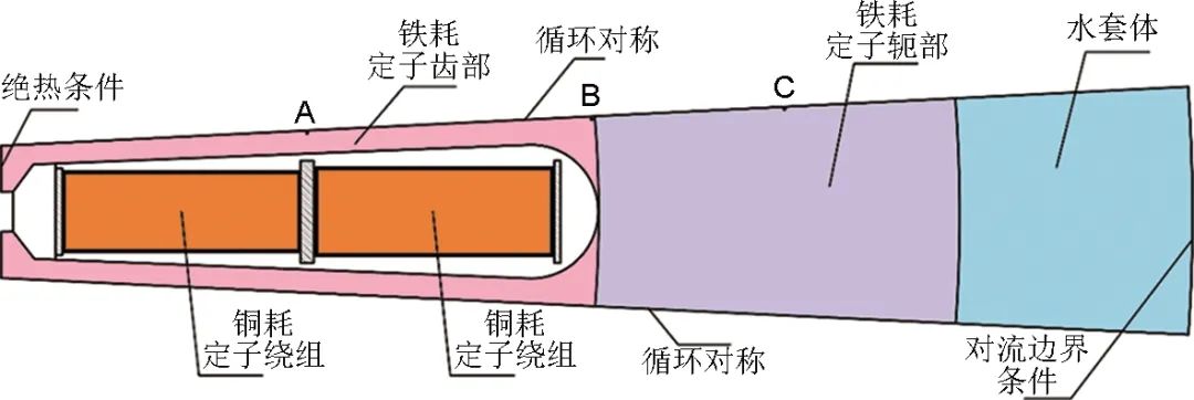 電機(jī)定子銅耗、定子齒部和軛部的鐵耗不同,分別設(shè)置不同的內(nèi)熱源。由于電機(jī)轉(zhuǎn)子另外設(shè)計(jì)了散熱,其溫度不高,且電機(jī)整體處于真空環(huán)境下,風(fēng)損很小,靠近轉(zhuǎn)子部分的定子齒部設(shè)置了絕熱條件。在定子軛部外側(cè)設(shè)置了水套體,使用公式(8)得到的等效對(duì)流換熱系數(shù),在水套體外側(cè)設(shè)置對(duì)流邊界條件以考慮定子水套冷卻,相關(guān)設(shè)置見圖3。