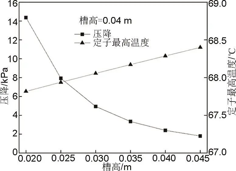 根據(jù)公式(10)可得所用螺旋水套的摩擦阻力。如圖7所示,在槽寬0.03 m時(shí),隨著槽高的增大,計(jì)算得到的壓降逐漸減小,定子最高溫度升高。在槽寬0.03 m時(shí),壓降為10.0 kPa,定子最高溫度為67.82 ℃,槽寬為0.05 m時(shí),壓降降低到2.9 kPa,定子最高溫度升高為68.30 ℃。
