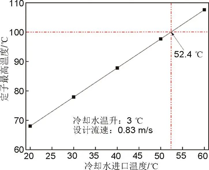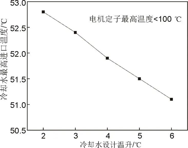 在電機(jī)最大熱損耗下,為滿足定子最高溫度小于100 ℃,冷卻水設(shè)計(jì)溫升與冷卻水最高進(jìn)口溫度的關(guān)系如圖10所示。可以看到,隨著冷卻水設(shè)計(jì)溫升的增大,冷卻水最高進(jìn)口溫度逐漸減小,近似呈線性。冷卻水設(shè)計(jì)溫升從2 ℃提高到6 ℃,流量降低,冷卻水進(jìn)口溫度需從52.8 ℃降低至51.1 ℃。