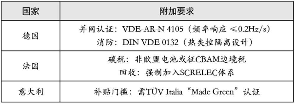 此外,歐洲部分國家對儲能標準有各自不同的附加要求,具體見表3。