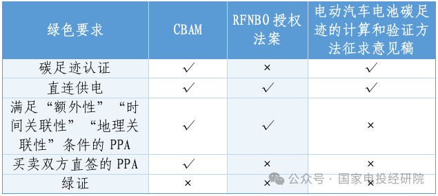 總體來看,歐盟無統(tǒng)一的綠電認(rèn)證標(biāo)準(zhǔn),不同產(chǎn)品碳足跡核算或綠色認(rèn)證標(biāo)準(zhǔn)中對(duì)綠電認(rèn)定規(guī)則有所差異(見表1)。