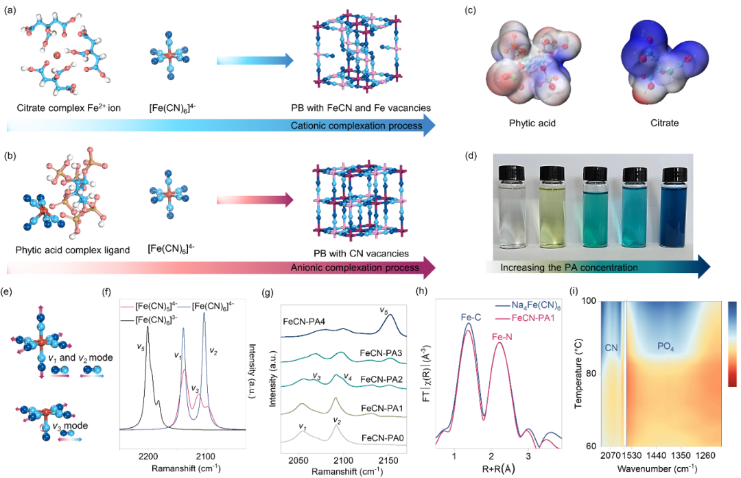 隨著可持續(xù)新能源的不斷發(fā)展,開發(fā)先進的電化學(xué)儲能器件對于可再生能源有效集成到智能電網(wǎng)中至關(guān)重要。鈉離子電池以其鈉資源豐富、成本低、安全性高等特點,被認(rèn)為是最有前途的大規(guī)模電網(wǎng)應(yīng)用儲能系統(tǒng)之一。普魯士藍(PB)因其高理論容量、低成本及開放框架結(jié)構(gòu),被視為鈉離子電池的理想正極材料。然而,傳統(tǒng)共沉淀法合成的普魯士藍存在大量[Fe(CN)?]空位,導(dǎo)致其較差的循環(huán)穩(wěn)定性,難以滿足低成本儲能的需求。目前廣泛采用的陽離子絡(luò)合劑策略可以有效提升普魯士藍的結(jié)晶度,但是仍然伴隨著較差的低自旋鐵穩(wěn)定性差的問題。有研究表明通過空位工程合理引入陰離子空位可提升穩(wěn)定性,然而由于陽離子絡(luò)合劑無法實現(xiàn)對陰離子的結(jié)構(gòu)調(diào)控。因此,開發(fā)可控合成策略并揭示陰離子空位的作用機制,成為推動普魯士藍材料應(yīng)用的關(guān)鍵。