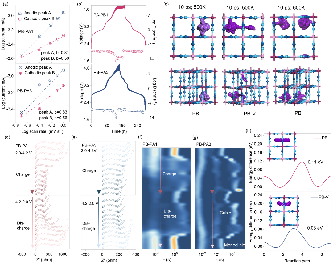 該研究首次提出利用競爭配位作用絡(luò)合亞鐵氰根的陰離子絡(luò)合策略,實現(xiàn)CN空位的可控引入。(圖1)通過原位表征和理論計算闡明了氰根空位通過配體場對稱破缺策略將高對稱Oh群穩(wěn)定配體場轉(zhuǎn)變?yōu)榈蛯ΨQ子群,為電子重新分布并發(fā)生自旋翻轉(zhuǎn)提供可能,在電化學(xué)性能上表現(xiàn)為不穩(wěn)定的低自旋鐵活性轉(zhuǎn)變?yōu)榉€(wěn)定的高自旋鐵,從而解決了普魯士藍中低自旋鐵不穩(wěn)定的難題。將上述過程總結(jié)并提出一種空位誘導(dǎo)下的“自旋轉(zhuǎn)變耦合晶格彎曲”機制(圖2)。并且在動力學(xué)也證明空位引入可以改變晶體電子云分布并且降低鈉離子的擴散能壘,從而提升電極材料的倍率性能,具有優(yōu)異的快充快放性能(圖3)。在20C大電流充放電下循環(huán)4000次容量保持率為79%,為迄今報道的最佳PB基鈉電陰極之一(圖4)。該研究不僅提供了精準(zhǔn)調(diào)控氰基空位的合成新范式,更通過“自旋轉(zhuǎn)變-晶格彎曲”機制破解了普魯士藍材料的長循環(huán)穩(wěn)定性難題,為下一代鈉電正極材料開辟了新路徑。未來,該方法有望推動低成本儲能技術(shù)邁向?qū)嵱没凸こ袒瘧?yīng)用。