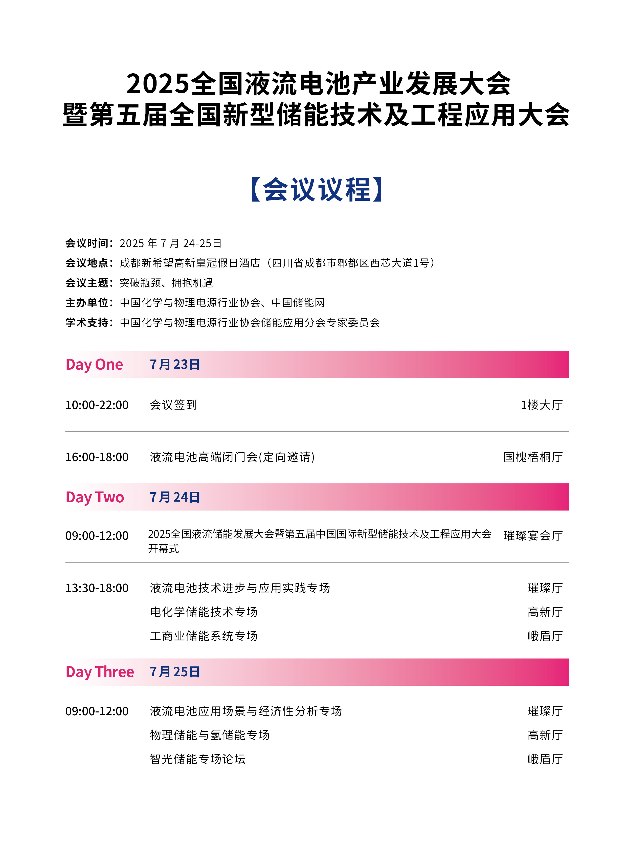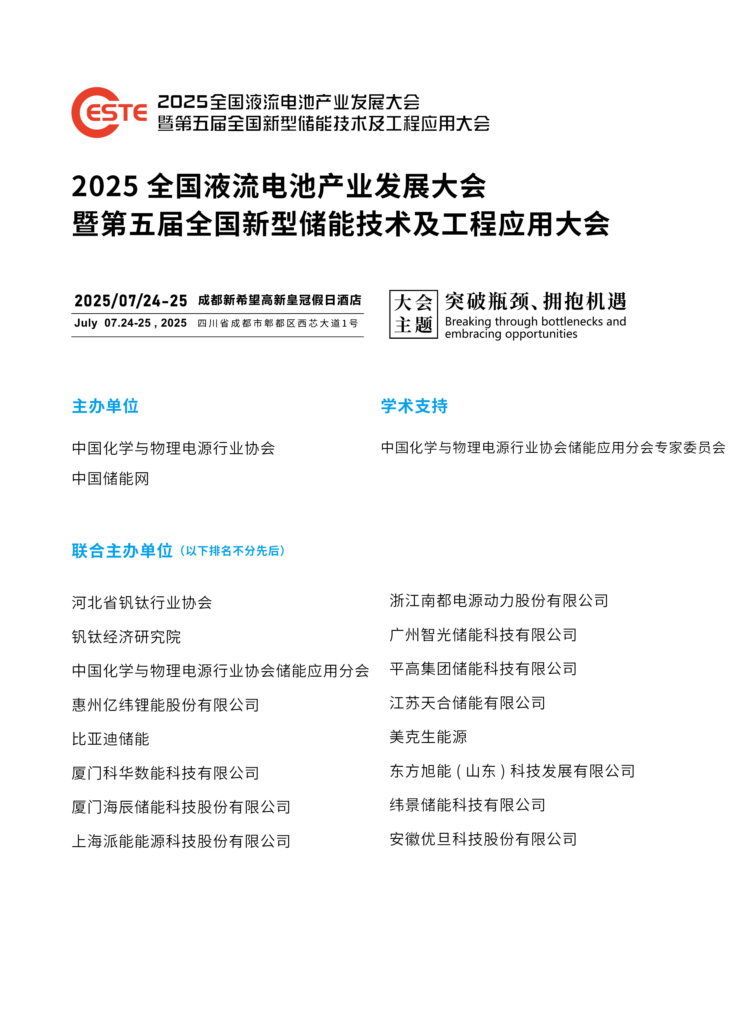 中國儲能網(wǎng)訊:由中國化學(xué)與物理電源行業(yè)協(xié)會聯(lián)合河北省釩鈦行業(yè)協(xié)會等主辦的2025全國液流電池產(chǎn)業(yè)發(fā)展大會暨第五屆全國新型儲能技術(shù)及工程應(yīng)用大會,將定于7月23日-25日在成都召開。會議同期召開第六屆全國工商業(yè)儲能產(chǎn)業(yè)發(fā)展研討會和液流電池產(chǎn)業(yè)高端閉門會。
