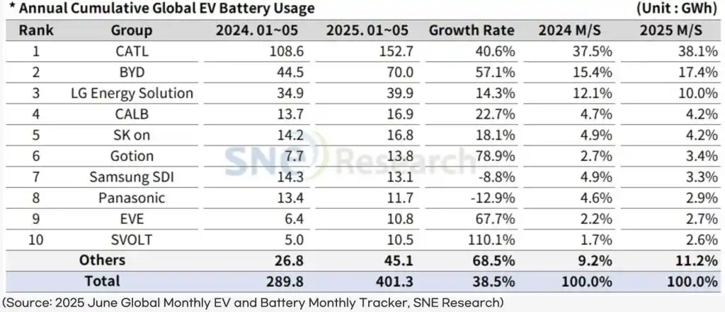 中國儲(chǔ)能網(wǎng)訊:寧德時(shí)代(300750.SZ/03750.HK)、比亞迪(002594.SZ/01211.HK)等中國動(dòng)力電池企業(yè)在全球市場的市占率還在進(jìn)一步刷新高度。韓國市場調(diào)研機(jī)構(gòu)SNE Research最新發(fā)布的統(tǒng)計(jì)顯示,2025年1-5月,全球電動(dòng)汽車電池裝車量約為401.3GWh,和上年同期相比(同比)增長38.5%。在裝車量前十大榜單中,寧德時(shí)代、比亞迪、中創(chuàng)新航(03931.HK)、國軒高科(002074.SZ)、億緯鋰能(300014.SZ)、蜂巢能源六家中企在全球的市場占有率合計(jì)為68.4%,同比增加了4.2個(gè)百分點(diǎn)。
