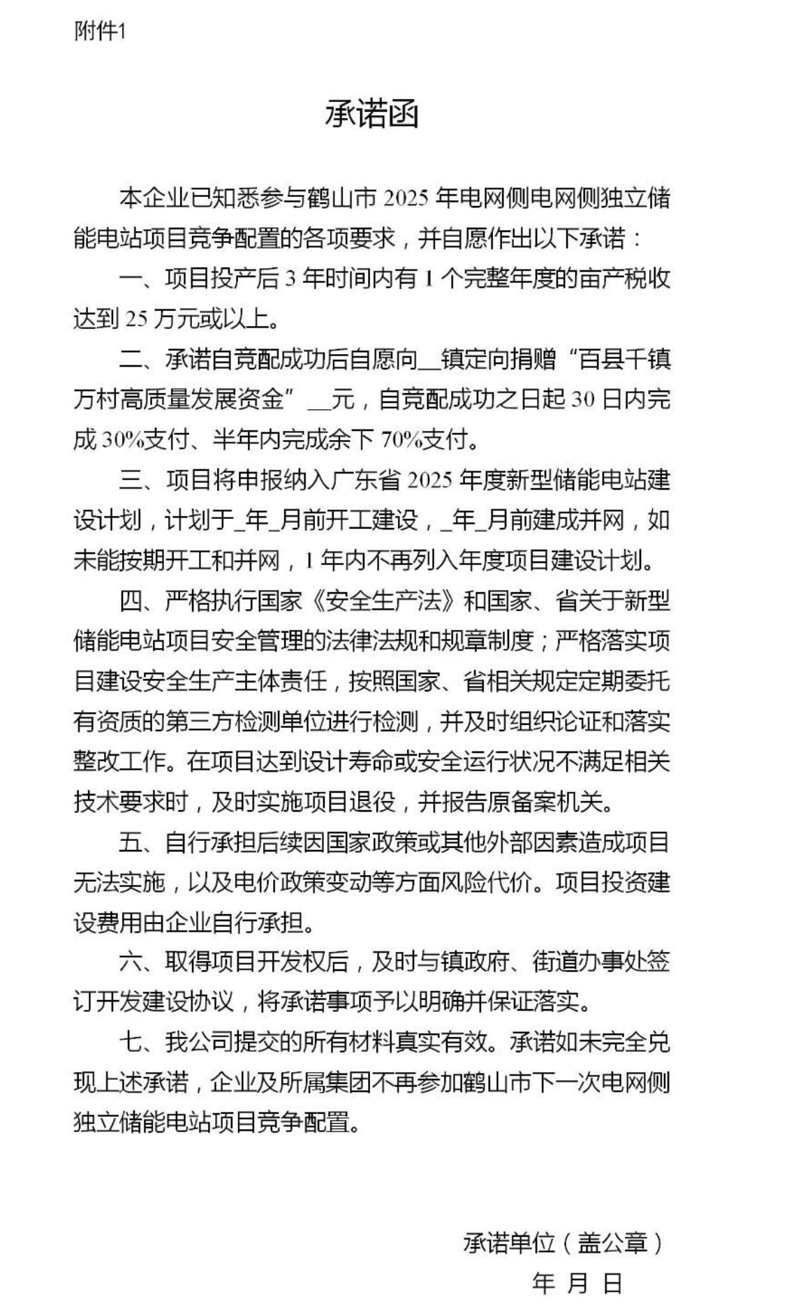 牽頭主體或聯(lián)合體主體提交參加鶴山市2025年電網(wǎng)側(cè)獨(dú)立儲能電站競爭配置的函。