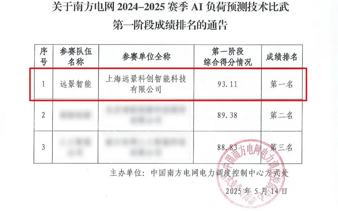 近日,南方電網(wǎng)發(fā)布2024-2025賽季 AI負(fù)荷預(yù)測(cè)技術(shù)競(jìng)賽成績(jī)排名,遠(yuǎn)景負(fù)荷預(yù)測(cè)技術(shù)位列第一。遠(yuǎn)景也是唯一一家獲得南方電網(wǎng)競(jìng)賽負(fù)荷/功率預(yù)測(cè)雙第一的公司。