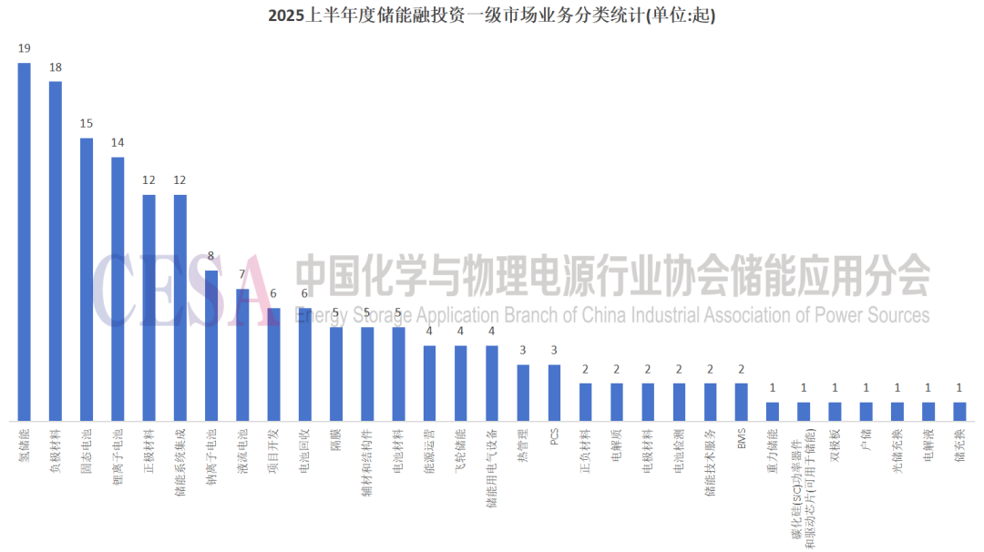 2025年上半年,我國儲能領域一級市場投融資活動呈現多元化與技術驅動并行的特征。氫儲能以19起融資領跑,凸顯其在長時儲能和清潔能源轉換中的戰(zhàn)略地位;負極材料緊隨其后18起,反映電池產業(yè)鏈對核心材料性能提升的持續(xù)投入。
