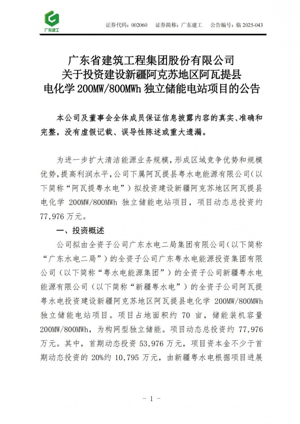 200MW/800MWh!廣東建工擬投建新疆阿克蘇地區(qū)阿瓦提縣電化學(xué)獨(dú)立儲(chǔ)能電站項(xiàng)目
