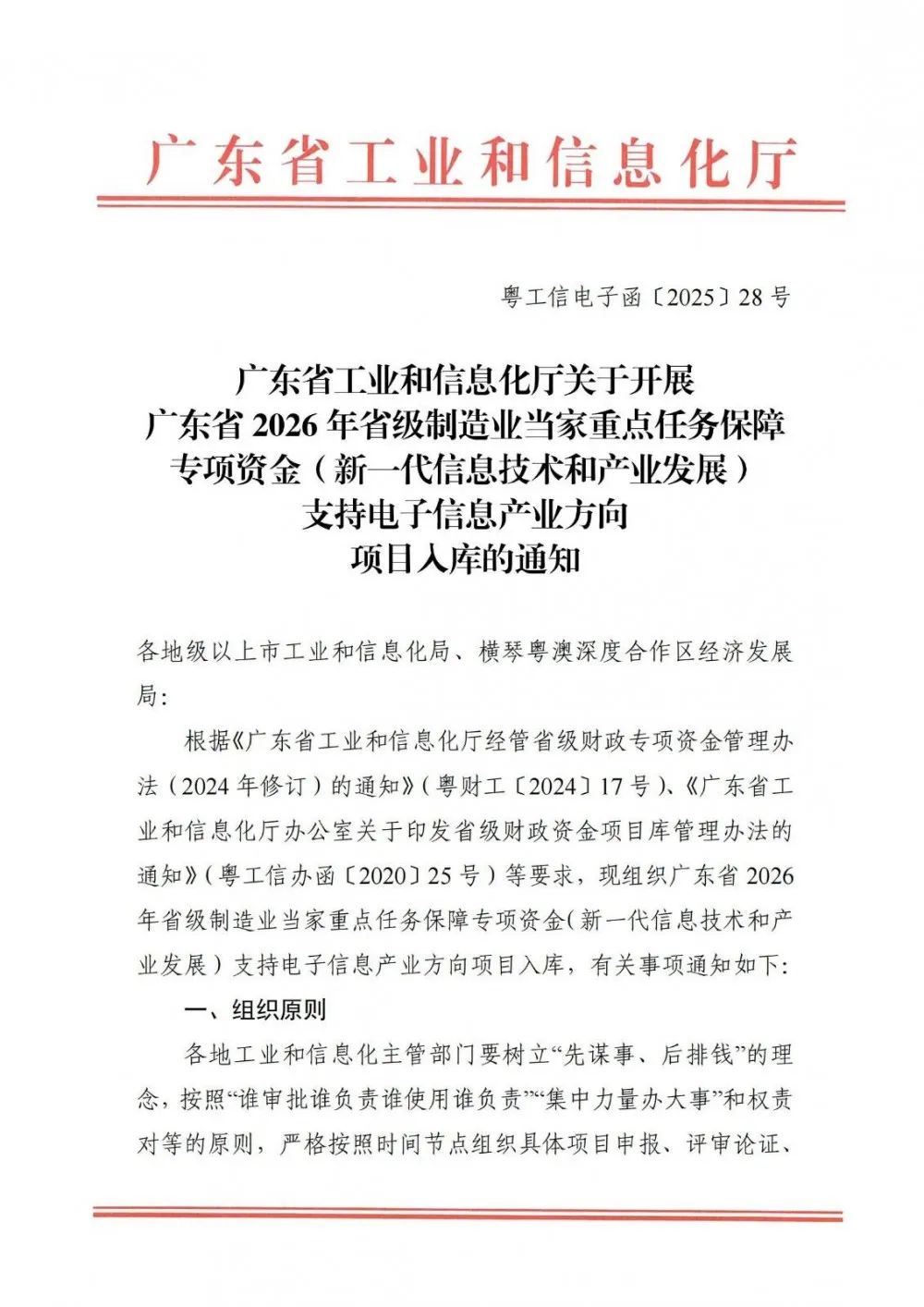 現(xiàn)將《廣東省工業(yè)和信息化廳關(guān)于開展廣東省2026年省級制造業(yè)當家重點任務(wù)保障專項資金(新一代信息技術(shù)產(chǎn)業(yè)發(fā)展)支持電子信息產(chǎn)業(yè)方向項目通知》(粵工信電子函〔2025〕28號)轉(zhuǎn)發(fā)給你們,為做好我市項目入庫申報工作,有關(guān)事項通知如下: