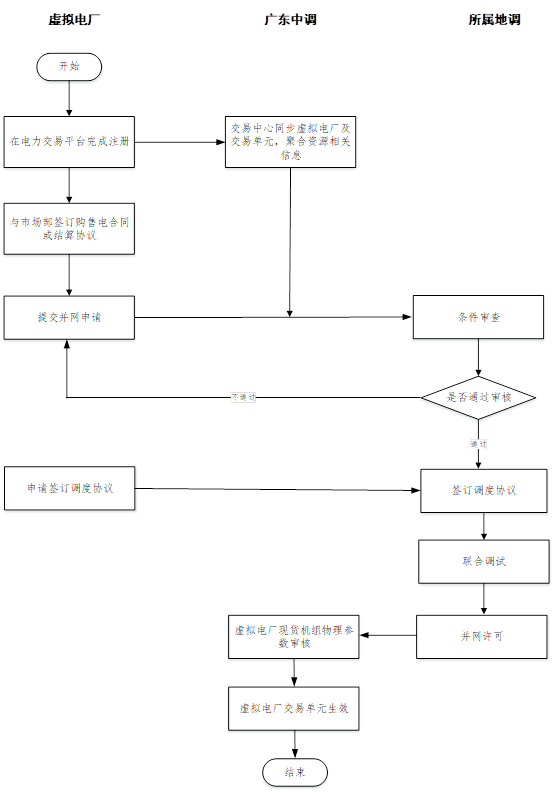 虛擬電廠并網(wǎng)流程分為:條件審查、簽訂調(diào)度協(xié)議、聯(lián)合調(diào)試、并網(wǎng)許可、并網(wǎng)運行管理。具體如下: