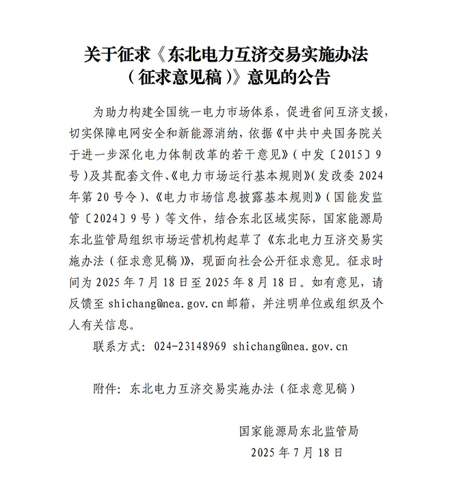 關(guān)于征求《東北電力互濟(jì)交易實(shí)施辦法(征求意見稿)》意見的公告
