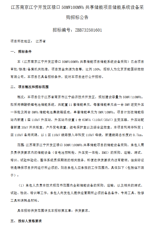 中國儲能網(wǎng)訊:7月22日,北京京能國際控股有限公司發(fā)布江蘇南京江寧開發(fā)區(qū)祿口50MW/100MWh共享儲能項目儲能系統(tǒng)設(shè)備招標(biāo)公告。項目位于江蘇省,項目資金來源為自籌,比例100%。