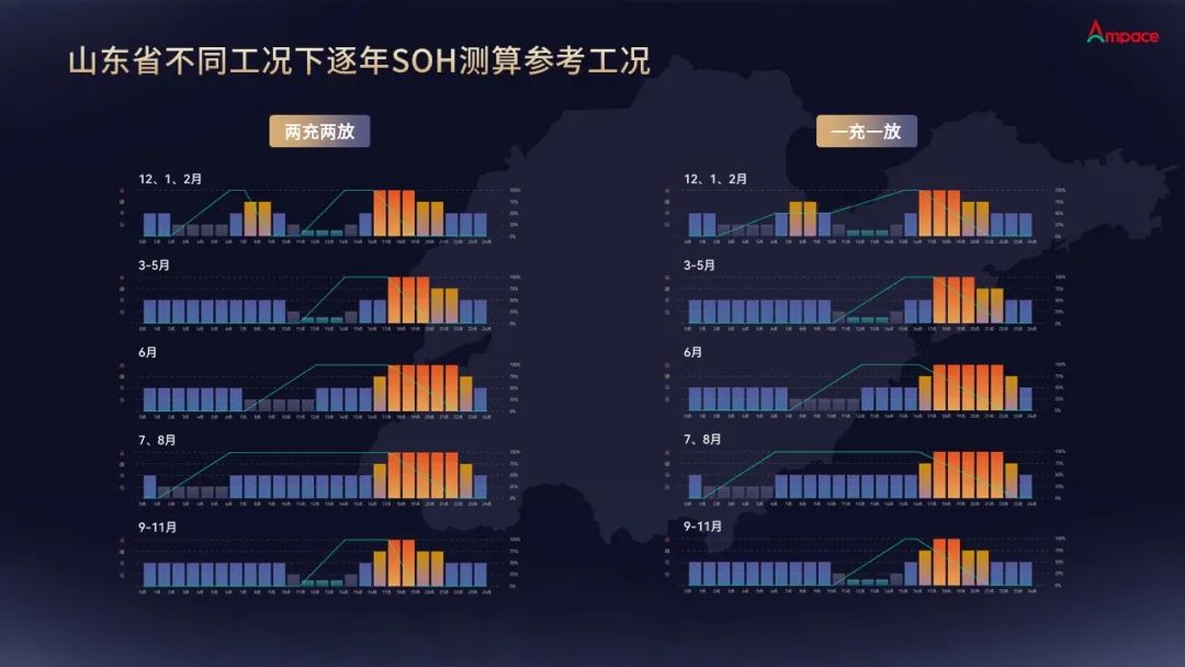 峰谷套利保障基礎(chǔ)收益:每年三個(gè)月的兩充兩放疊加一充一放的模式,山東領(lǐng)跑全國(guó)的0.9692元/kWh的峰谷價(jià)差。