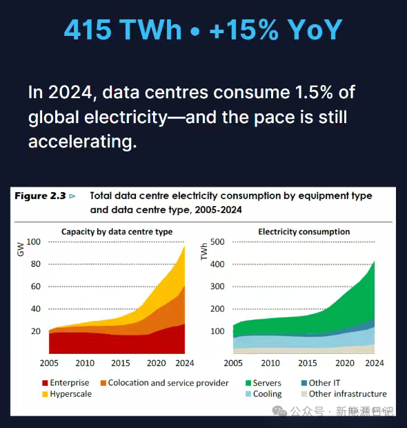 圖丨按設備類型和數(shù)據(jù)中心類型劃分的2005-2024年數(shù)據(jù)中心總能耗,2024年,數(shù)據(jù)中心消耗了全球電力的1.5%,而且這一速度仍在加快。
