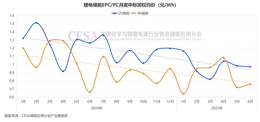 這一系列政策組合拳的出臺(tái)有著深刻行業(yè)背景。據(jù)CESA儲(chǔ)能應(yīng)用分會(huì)產(chǎn)業(yè)數(shù)據(jù)庫(kù)不完全統(tǒng)計(jì),2024年鋰電儲(chǔ)能EPC中標(biāo)均價(jià)為1.175元/Wh,同比下降16.07%。2024年鋰電儲(chǔ)能系統(tǒng)中標(biāo)均價(jià)0.574元/Wh,同比下降47.82%。2025年1—6月,鋰電儲(chǔ)能EPC/PC中標(biāo)均價(jià)0.9618元/Wh,同比下降24.09%。2025年1—6月,鋰電儲(chǔ)能系統(tǒng)中標(biāo)均價(jià)0.4848元/Wh,同比下降29.94%。