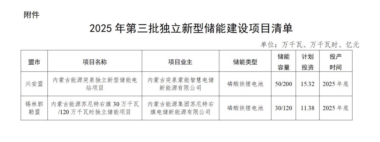 內蒙古自治區(qū)能源局關于印發(fā)2025年第三批獨立新型儲能建設項目清單的通知