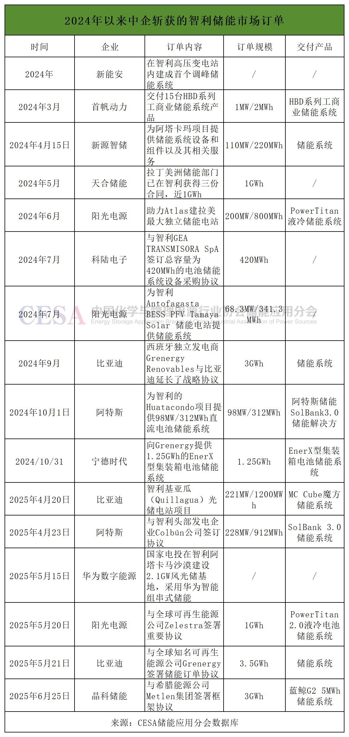 據(jù)CESA儲能應(yīng)用分會數(shù)據(jù)庫不完全統(tǒng)計,2024年以來,包括寧德時代、比亞迪、天合儲能、華為、科陸電子、阿特斯等11家企業(yè)共在智利市場拿下16.96GWh儲能訂單,僅2025年上半年,中國在智利儲能市場就拿下了9.6GWh訂單,是美國市場的2.5倍。