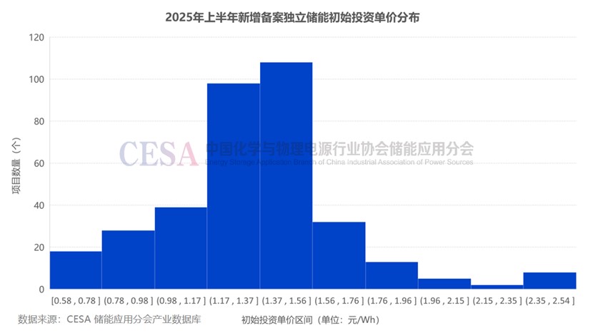 據(jù)CESA儲(chǔ)能應(yīng)用分會(huì)產(chǎn)業(yè)數(shù)據(jù)庫不完全統(tǒng)計(jì),2025年上半年新增備案的項(xiàng)目中,鋰電獨(dú)立儲(chǔ)能項(xiàng)目初始投資價(jià)格主要分布在0.58-2.54元/Wh區(qū)間內(nèi),平均單價(jià)1.3607元/Wh。超過一半的獨(dú)立儲(chǔ)能備案項(xiàng)目初始投資單價(jià)在1.17-1.56元/Wh范圍內(nèi)。