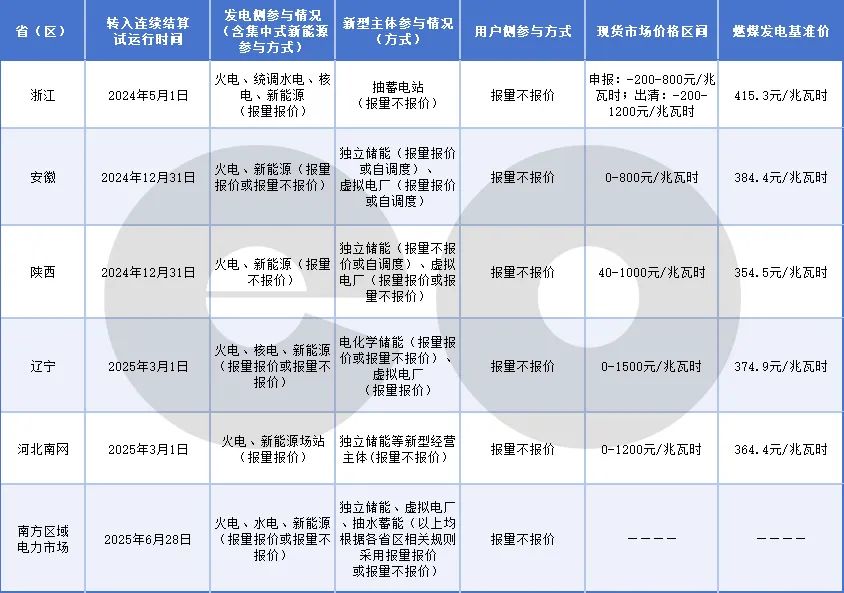 浙江、安徽、陜西、遼寧、河北南網(wǎng)等地和南方區(qū)域電力市場(chǎng)已轉(zhuǎn)入連續(xù)結(jié)算試運(yùn)行。eo據(jù)公開(kāi)資料梳理上述地區(qū)最新進(jìn)展如下表: