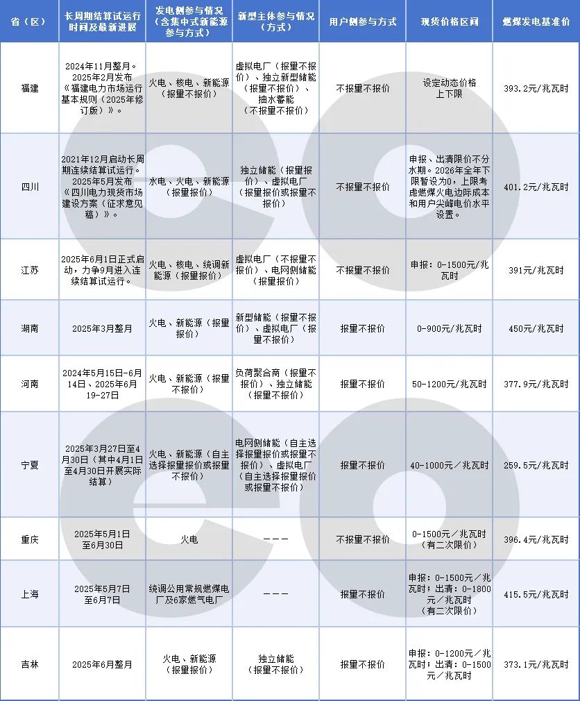 福建、四川、江蘇、湖南、河南、寧夏、重慶、上海、吉林等地已開(kāi)展過(guò)整月及以上長(zhǎng)周期結(jié)算試運(yùn)行。eo據(jù)公開(kāi)資料梳理上述地區(qū)最新進(jìn)展如下表:
