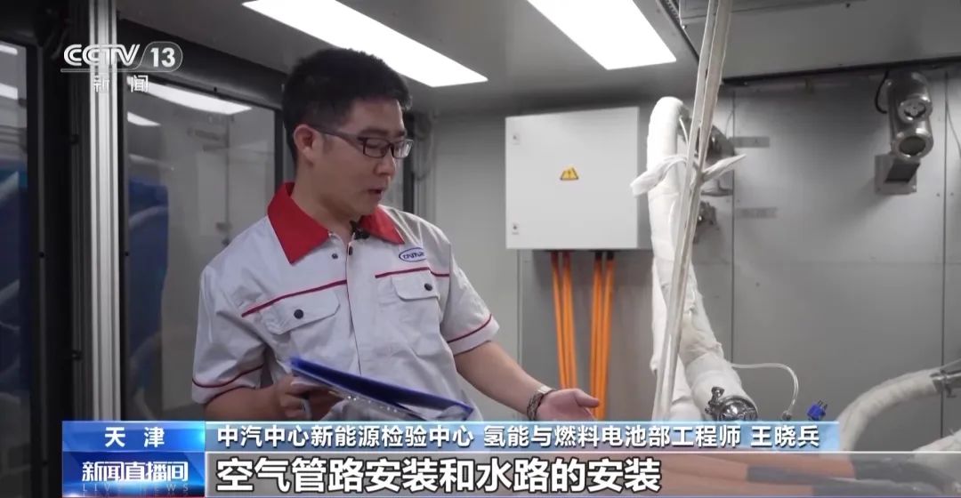 中汽中心新能源檢驗(yàn)中心氫能與燃料電池部工程師 王曉兵:在測試之前我們基本都會對樣品進(jìn)行燃料電池的氣密性的檢測,保證氫氣不會泄漏,包括整個氫氣管路的安裝、空氣管路安裝和水路的安裝,以及電子負(fù)載的負(fù)載線安裝,必須確保每一個連接步驟的安全性。