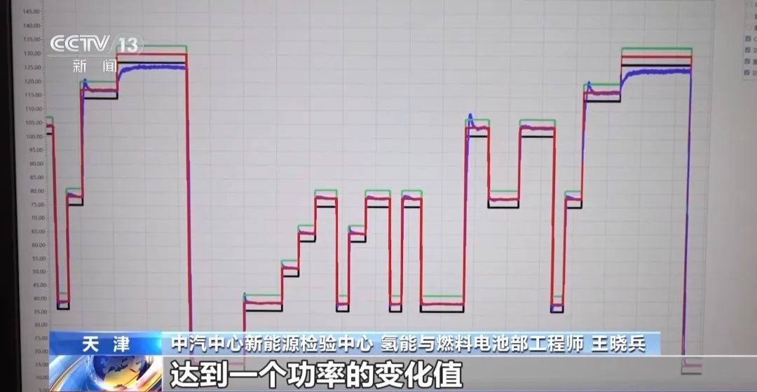 中汽中心新能源檢驗(yàn)中心氫能與燃料電池部工程師 王曉兵:這個線就是基于我們實(shí)際道路模擬司機(jī)的行為,開始啟停、高速、怠速,然后轉(zhuǎn)化出來的針對這個系統(tǒng)的工況。紅色的是實(shí)際要求達(dá)到一個功率的變化值,藍(lán)色的就是實(shí)際發(fā)出來的自己的表現(xiàn)。