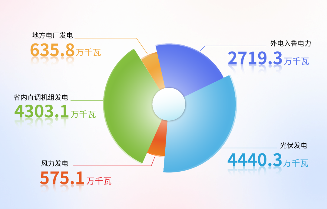 在該時(shí)刻,外電入魯電力達(dá)2719.3萬千瓦,風(fēng)光新能源合計(jì)5015.4萬千瓦(風(fēng)電575.1萬千瓦、光伏發(fā)電4440.3萬千瓦),省內(nèi)直調(diào)機(jī)組發(fā)電出力合計(jì)4303.1萬千瓦,地方電廠發(fā)電出力合計(jì)635.8萬千瓦。