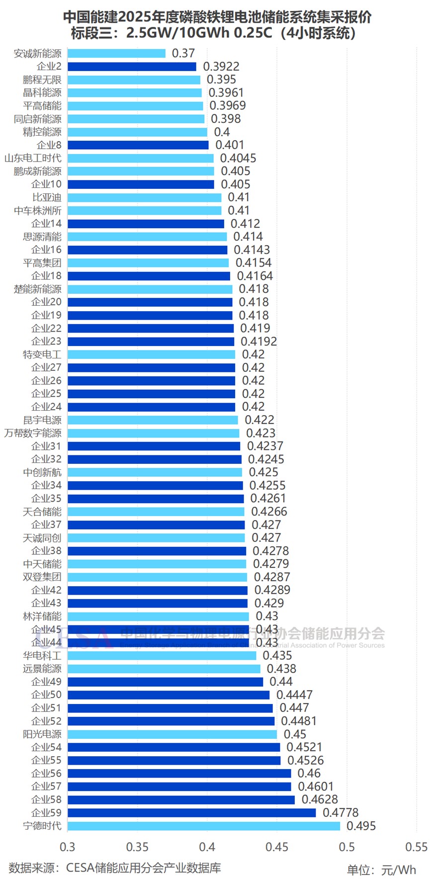 標(biāo)段三(4h儲能系統(tǒng)):采招規(guī)模為2.5GW/10GWh,60家企業(yè)參與競標(biāo),共26家企業(yè)入圍,入圍報價在0.37-0.495元/Wh區(qū)間內(nèi),平均報價0.4185元/Wh,最低報價0.37元/Wh來自于安誠新能源,創(chuàng)4h鋰電儲能系統(tǒng)報價新低。