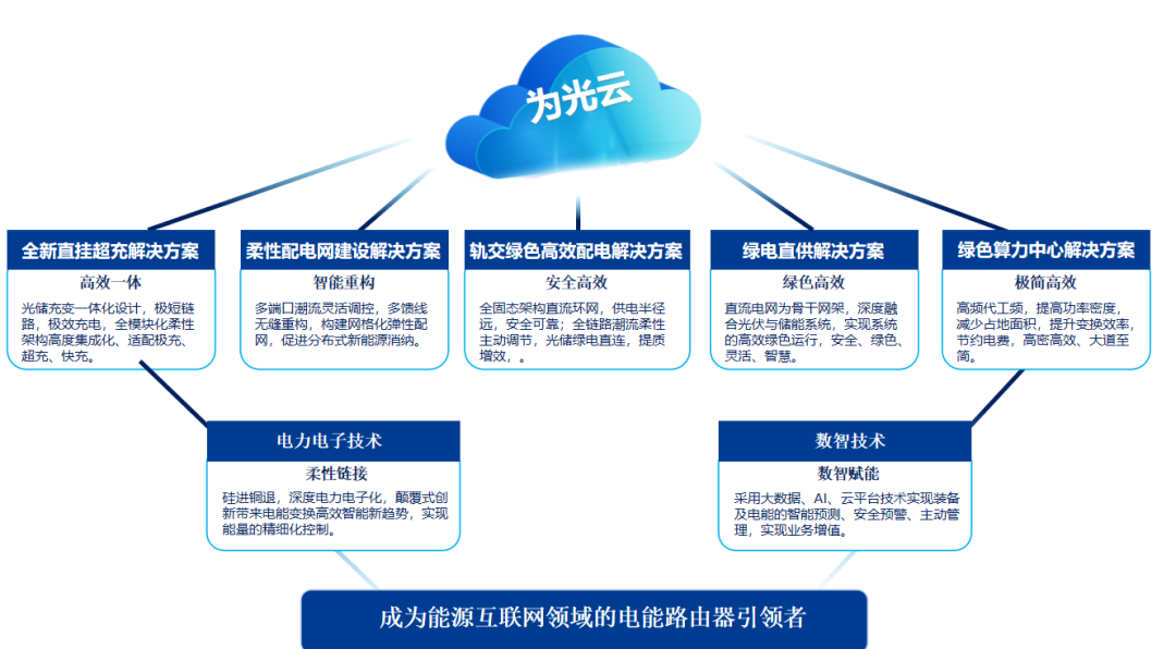 充電站中壓直掛解決方案:針對(duì)電動(dòng)汽車CCS及MCS充電場(chǎng)景,為光能源推出基于電能路由器的直掛超充矩陣,電能路由器采用固態(tài)變壓器技術(shù)替代傳統(tǒng)變壓器和變流設(shè)備,實(shí)現(xiàn)了全鏈條電力電子化,為用戶提供極全、極簡(jiǎn)、極速、極效的“四極”充電體驗(yàn)。