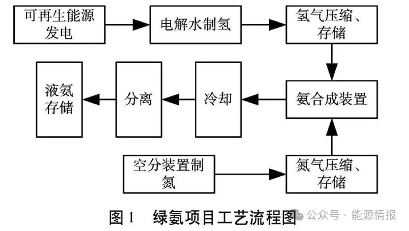 綠氨生產(chǎn)的核心環(huán)節(jié)包括綠氫制備、氮?dú)庵苽浜秃铣砂?。其中,綠氫制備主要通過電解水制得,氮?dú)鈩t通過空氣分離設(shè)備從空氣中提取。合成氨環(huán)節(jié)則采用傳統(tǒng)的Haber-Bosch法或其他改進(jìn)工藝。具體見圖1。