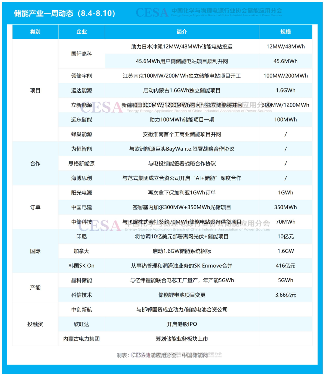 項(xiàng)目方面,立新能源新疆和田300MW/1200MWh構(gòu)網(wǎng)型獨(dú)立儲(chǔ)能將并網(wǎng);領(lǐng)儲(chǔ)宇能江蘇南京100MW/200MWh獨(dú)立儲(chǔ)能電站項(xiàng)目開工;國(guó)軒高科45.6MWh用戶側(cè)儲(chǔ)能電站項(xiàng)目順利并網(wǎng);運(yùn)達(dá)能源啟動(dòng)內(nèi)蒙古1.6GWh獨(dú)立儲(chǔ)能項(xiàng)目;蜂巢能源安徽淮南首個(gè)工商業(yè)儲(chǔ)能項(xiàng)目并網(wǎng)。