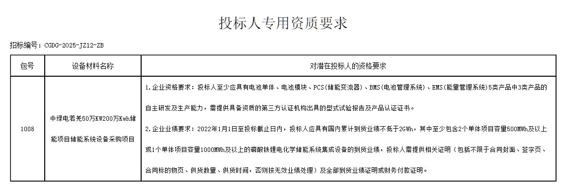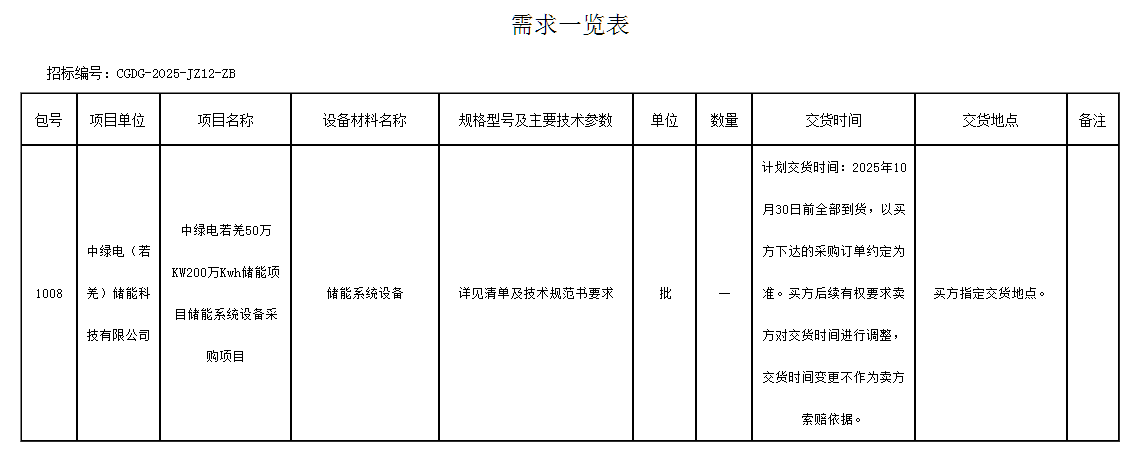其中儲能系統(tǒng)采購要求交貨時間為2025年10月30日前全部到貨,以買方下達的采購訂單約定為準。要求投標人應(yīng)具有國內(nèi)累計到貨業(yè)績不低于2GWh,其中至少包含2個單體項目容量500MWh及以上或1個單體項目容量1GWh及以上的磷酸鐵鋰電化學儲能系統(tǒng)集成設(shè)備的到貨業(yè)績。