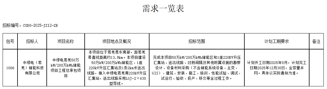 中國儲能網(wǎng)訊:8月11日,中國綠發(fā)投資集團發(fā)布中綠電若羌500MW/2000MWh儲能項目EPC及儲能系統(tǒng)設(shè)備采購招標。