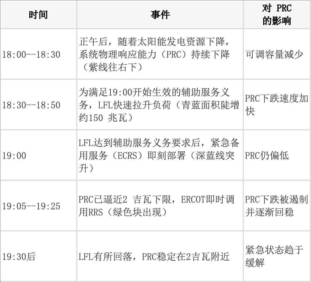 2023年9月6日傍晚,得州ERCOT電網(wǎng)進(jìn)入緊急能源警報(bào)(EEA)狀態(tài)(圖4)。其核心原因之一是:大型柔性負(fù)荷為履行其輔助服務(wù)義務(wù),在系統(tǒng)物理響應(yīng)能力(PRC)不足時(shí)段反而快速拉升“出力”。負(fù)荷拉升與太陽(yáng)能出力下降相疊加,導(dǎo)致系統(tǒng)可調(diào)容量PRC驟降并接近警戒水平。最終,ERCOT被迫緊急調(diào)用響應(yīng)式備用服務(wù)(RRS)才挽回PRC下降趨勢(shì)。