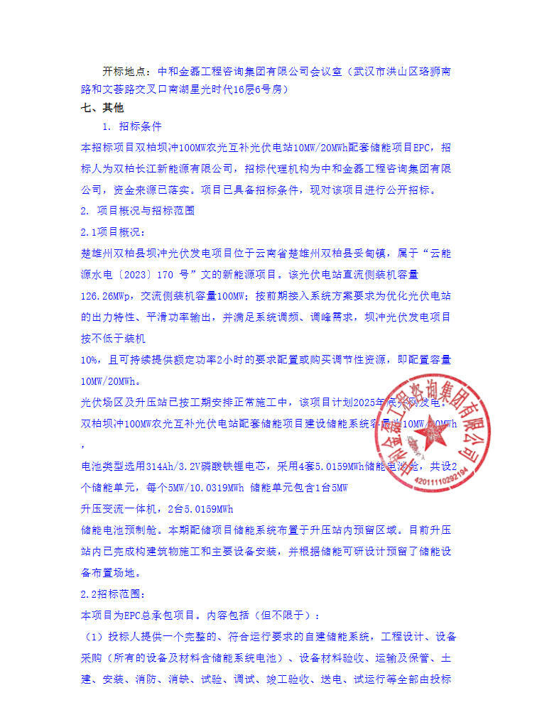 中國儲能網(wǎng)訊:8月14日,雙柏壩沖100MW農(nóng)光互補光伏電站10MW/20MWh配套儲能項目EPC招標(biāo)公告發(fā)布。