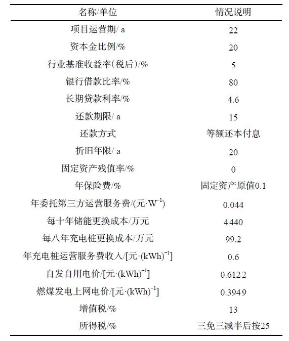 本項(xiàng)目是某大型國(guó)有能源企業(yè)通過(guò)“投資+EPC”方式,利用公路紅線內(nèi)的可利用空地,開(kāi)發(fā)沿線光伏等可再生能源資源,構(gòu)建“源-網(wǎng)-荷-儲(chǔ)”多層級(jí)一體化交能融合系統(tǒng),為基礎(chǔ)設(shè)施和運(yùn)輸車輛提供綠色清潔能源。項(xiàng)目所在地為華北某區(qū)域,光伏年平均利用小時(shí)數(shù)1096小時(shí),路域光伏119兆瓦,服務(wù)區(qū)和收費(fèi)站光伏5兆瓦,充電樁32座,智慧路燈16套,風(fēng)機(jī)32套,儲(chǔ)能10兆瓦時(shí)。項(xiàng)目經(jīng)濟(jì)評(píng)價(jià)參數(shù)如下表所示。
