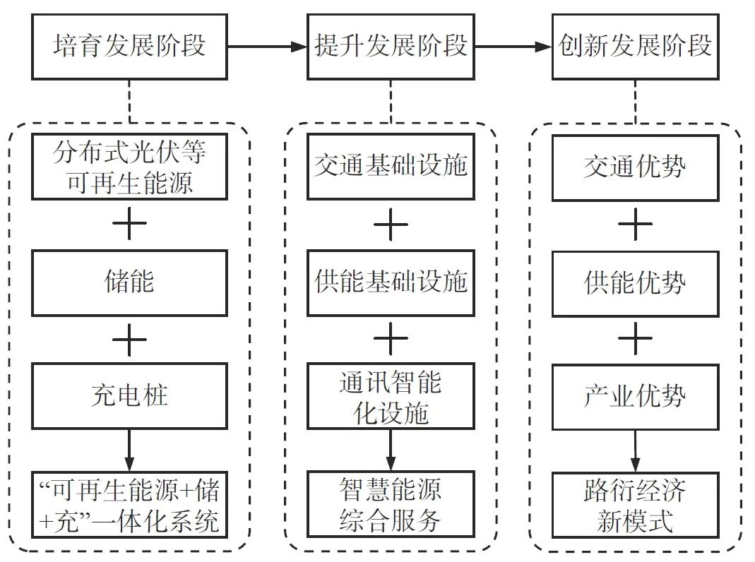 第1階段是把握自然資源優(yōu)勢(shì)的培育發(fā)展階段。充分利用光照等可再生資源,以分布式光伏等可再生能源系統(tǒng)為中心,配合儲(chǔ)能站和充電樁建設(shè),構(gòu)建“可再生能源+儲(chǔ)+充”一體化系統(tǒng)。