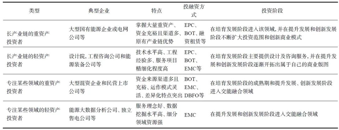 本文基于資產(chǎn)結(jié)構(gòu)和產(chǎn)業(yè)鏈延伸度將交能融合項(xiàng)目的投資者分為長(zhǎng)產(chǎn)業(yè)鏈的重資產(chǎn)投資者、長(zhǎng)產(chǎn)業(yè)鏈的輕資產(chǎn)投資者、專注某些領(lǐng)域的重資產(chǎn)投資者、專注某些領(lǐng)域的輕資產(chǎn)投資者。不同類型的投資者具有相應(yīng)的特點(diǎn)和投融資方式,并在不同發(fā)展階段進(jìn)入交能融合領(lǐng)域,具體如下表所示。