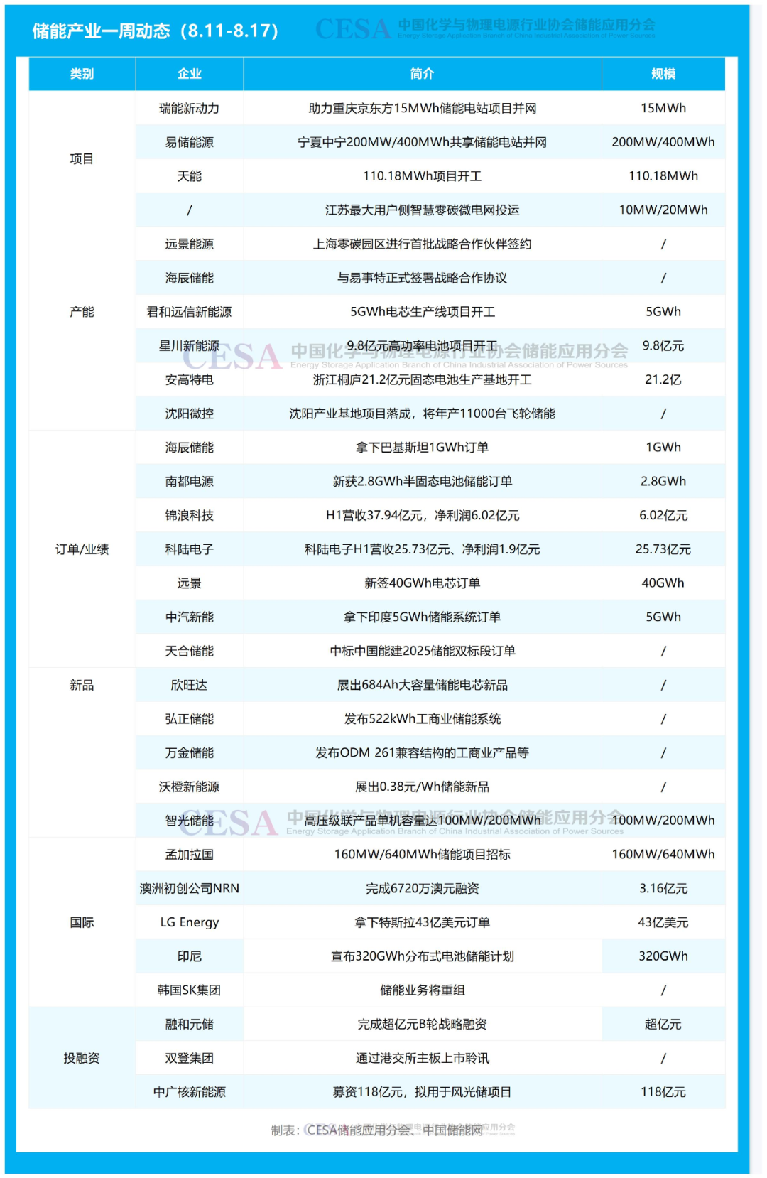 訂單/業(yè)績(jī)方面,海辰儲(chǔ)能拿下巴基斯坦1GWh訂單;中汽新能拿下印度5GWh儲(chǔ)能系統(tǒng)訂單;天合儲(chǔ)能中標(biāo)中國(guó)能建2025儲(chǔ)能雙標(biāo)段訂單;南都電源新獲2.8GWh半固態(tài)電池儲(chǔ)能訂單;遠(yuǎn)景新簽40GWh電芯訂單。