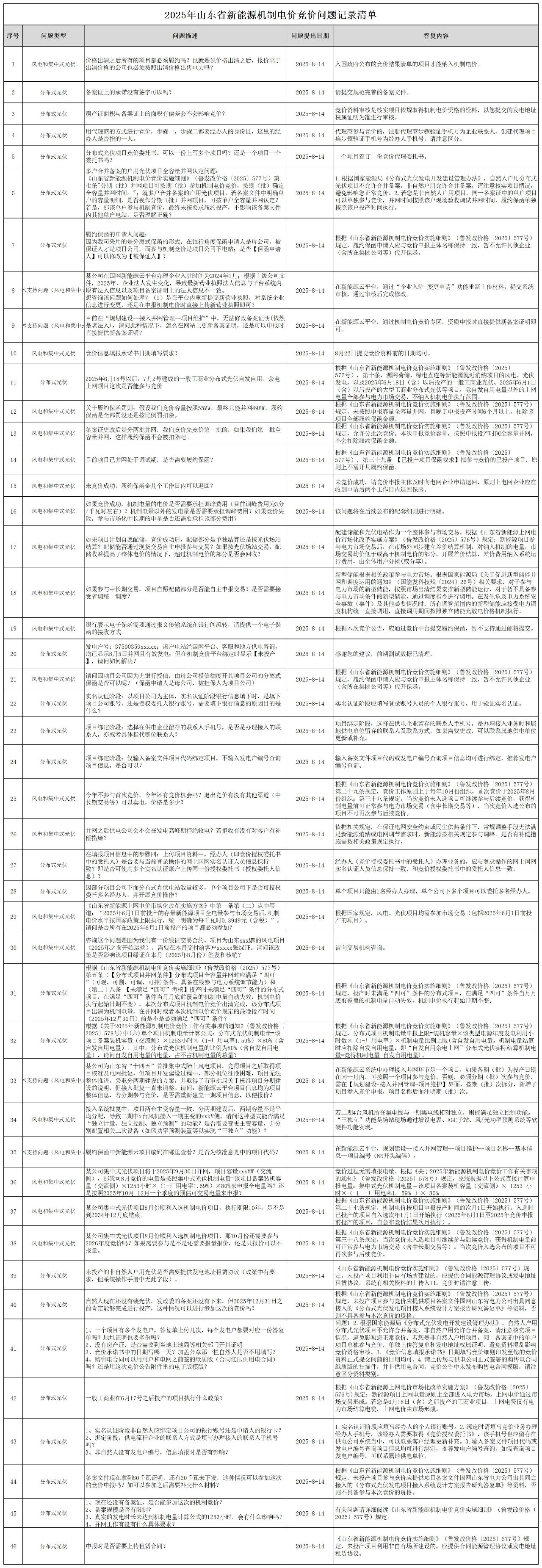 中國儲能網(wǎng)訊:日前,山東省發(fā)改委發(fā)布《2025年山東省新能源機制電價競價問題記錄清單》,匯總的問題更新至8月18日。